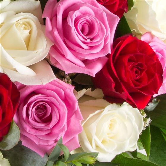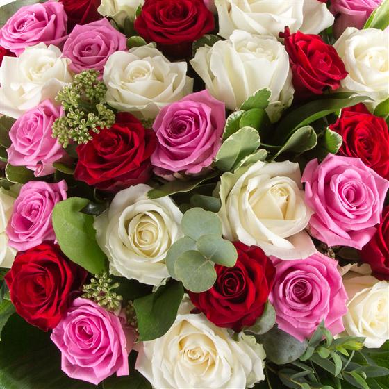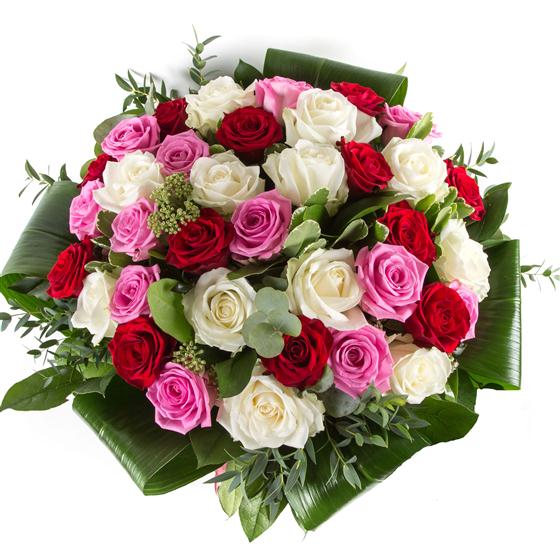 A show stopping hand-tied bouquet of 36 closely bound roses in pink, red and white. Vase not included.