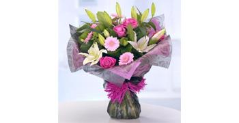 A stunning hand-tied bouquet with Lilies and Roses and other seasonal flowers, beautifully packaged for maximum impact.
