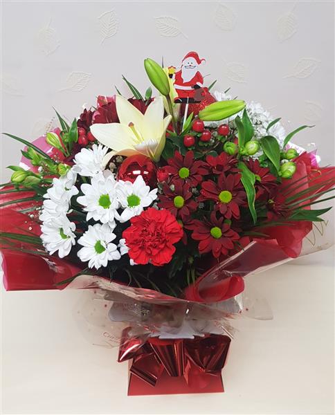 A bright bouquet in the colour theme shown, burgundy reds and whites with a Santa decoration. Photo for illustration.