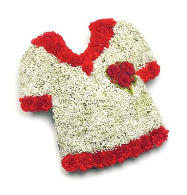 Football shirt made from Carnations, Roses and Gypsophila. Size: Base - 54cm (21") Height - 54cm (21"). Other colours available, please call for details and prices.