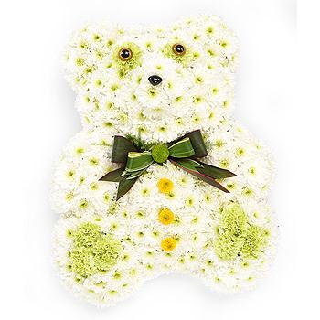 A lovely white Chrysanthemum based Teddy Bear with a green bow tie and green Chrysanthemum and Carnation detailing.